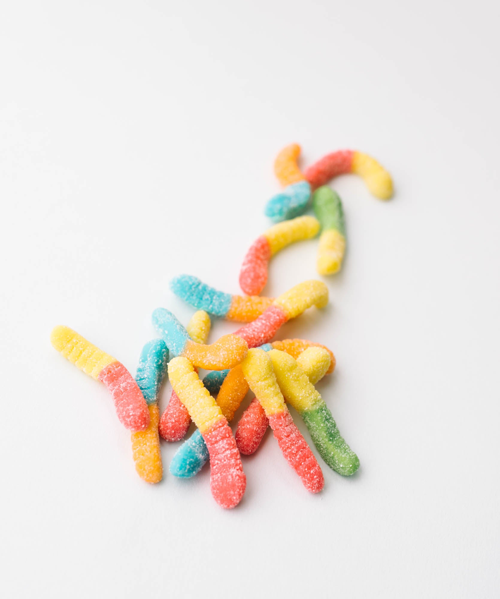 Pucker up for a sour take on these sweet Gummi Worms. Each Sour Mini Gummi Worm is dusted with a sour coating giving it a tart bite. Flavors include Blue Raspberry, Lemon, Orange, Cherry, and Green Apple.