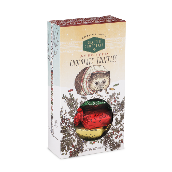 Back for the holidays! In this charming gift box designed by Seattle artist Frida Clements featuring an adorable hedgehog, you’ll find an assortment of three of our popular truffle flavors: Milk Chocolate, Champagne, Hiker’s Trail Mix.