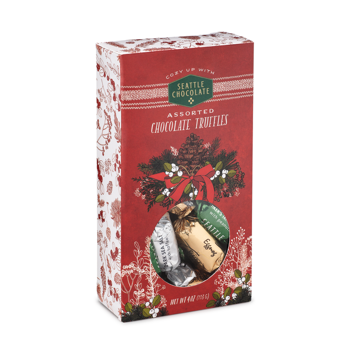 In this festive, seasonal gift box designed by Seattle artist Frida Clements, you’ll find an assortment of delicious truffle flavors: Dark Sea Salt Toffee, Milk Chocolate, Mint. 4oz - About 12 pieces.