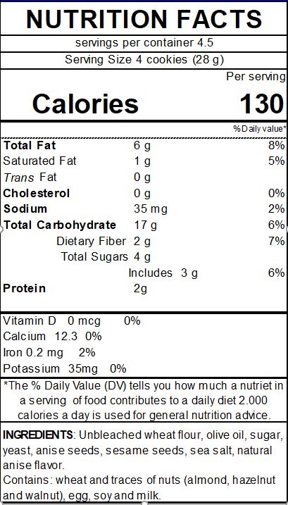 All of the original flavor of our Tortas concentrated in a deliciously baked Crisp . The same flavor as always. Now you can snack on it anywhere. Extra Virgin Olive Oil, aniseed, sesame... Carefully curated Mediterranean diet ingredients only